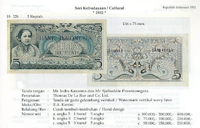 Ternyata pada katalog Pick tidak ditemukan penjelasan mengenai variasi satu huruf dari pecahan 5 rupiah seri kebudayaan. Di sana hanya dijelaskan sebagai: 1952. Gray-blue. R. Kartini at l (left). Jadi secara ringkas katalog Pick hanya menganggap bahwa pecahan ini terdiri dari satu jenis saja. Sedangkan pecahan 10 dan 25 rupiah yang di KUKI dibedakan menjadi 3 variasi, pada Pick hanya dibedakan menjadi 2 jenis.